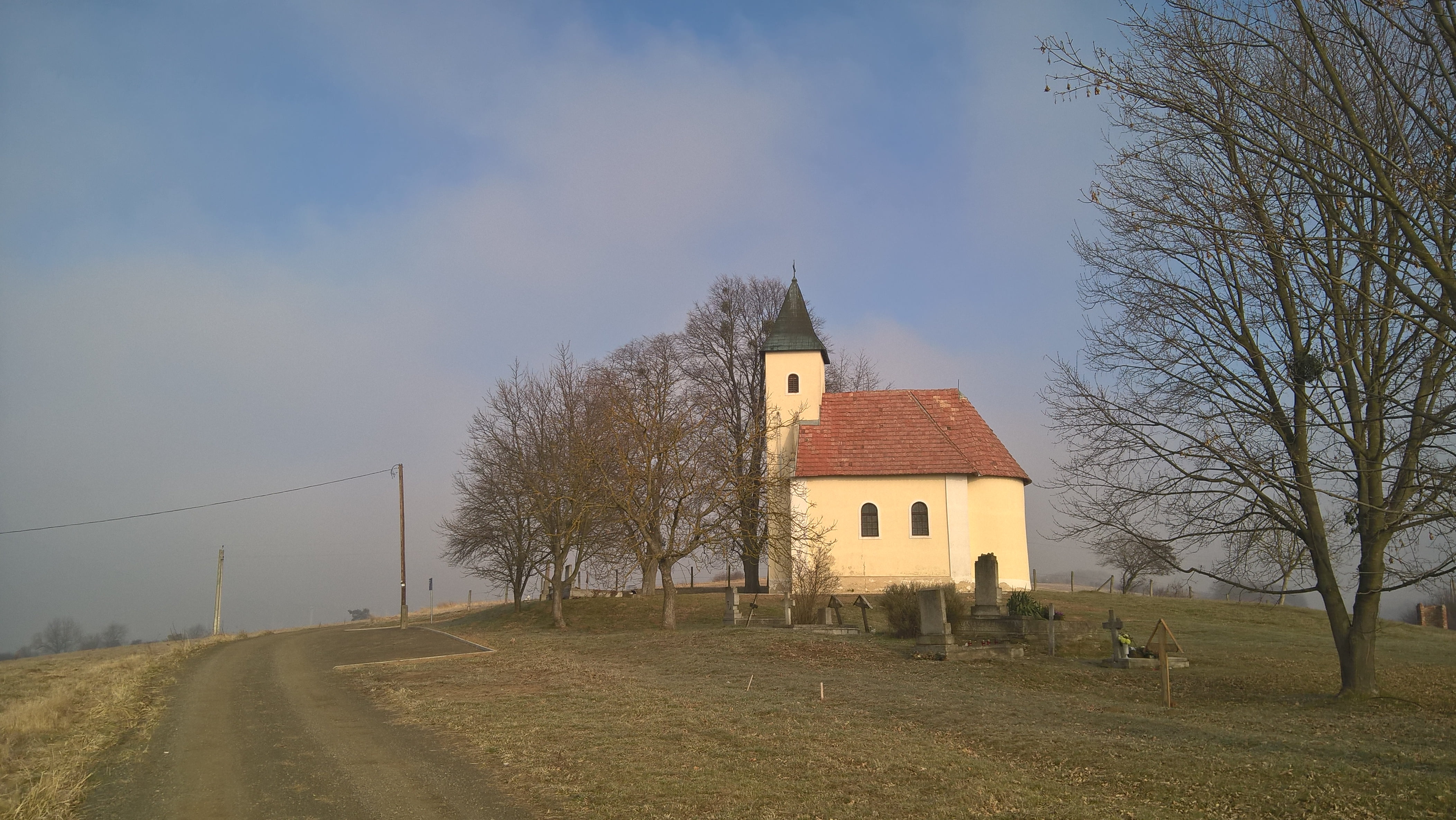 b. A letölthető track nem visz be a faluba, hanem levezet a kápolnához vezető úthoz, kikerülve a falut, jelzés nélkül (ez a régi kék+ jelzés útvonala). A kilométer számozás ehhez igazodik. 6,6 km-nél leérsz egy aszfaltozott útra, újra eléred a kék + jelzést, jobbra fordulsz, majd 100 méter múlva jobbra fel a kápolnához (Őrangyalok temploma). - 7 km-nél kápolna, 100 méter múlva a villanyoszlopnál élesen balra lefelé, benézhető.