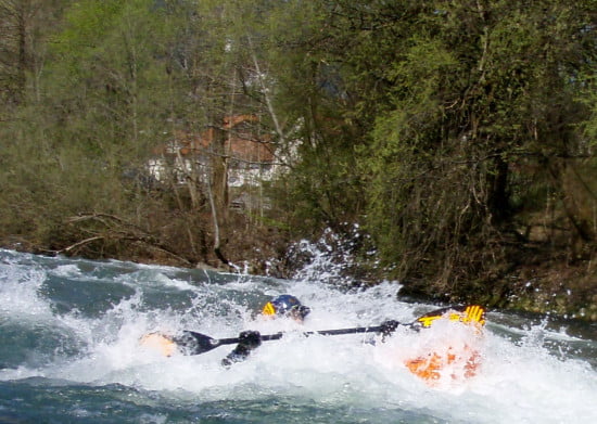 A Prodnik-i utolsó gát. Itt azért a víz megmutatta, hogy ő az úr. Először jöttem én, majd az András közvetlenül utánam. Elnagyképűsködte, szándékosan oldalról beleugrott a hengerbe. A henger befordította, próbált eszkimózni, közben meg jött már a Gábor. Lentről mutattam, hogy menjen odébb, sikerült is neki, különben pont a hengerben eszkimózni próbáló Andrásra esett volna. Evező el, levegő elfogy, András ki. Andrást hamar elengedte, de a hajót azért behúzta a közepébe és egy kicsit megcibálta. A Gábor kajakkal elment le a Scudért, mi addig Andrással vártuk, hogy hátha kidobja az evezőt. Nem dobta. A nagy várakozásban vettük észre, hogy a hengerben néha kibukkan egy ág. Innentől kezdve tudtuk, hogy a gát alatt van egy elakadt fa, az tartja fogva az evezőt.