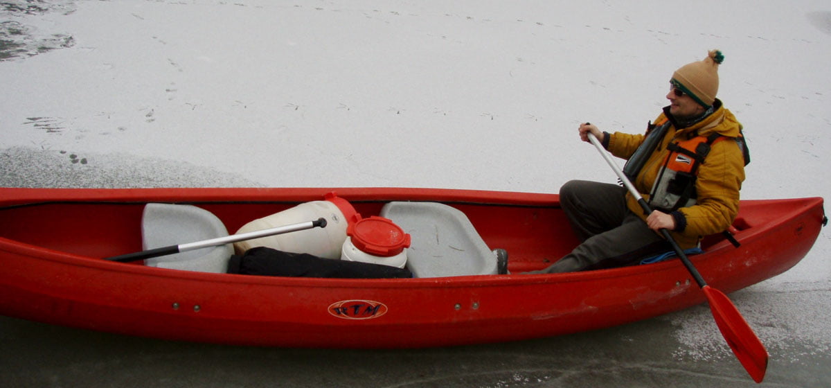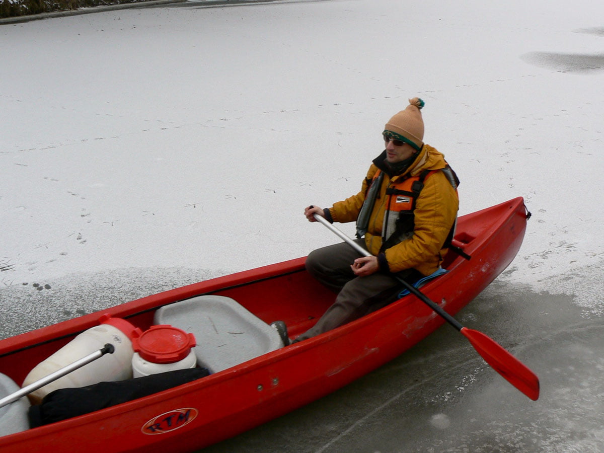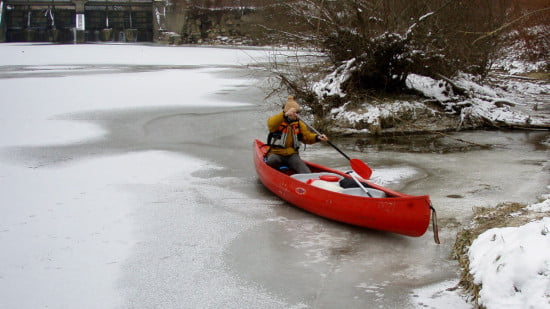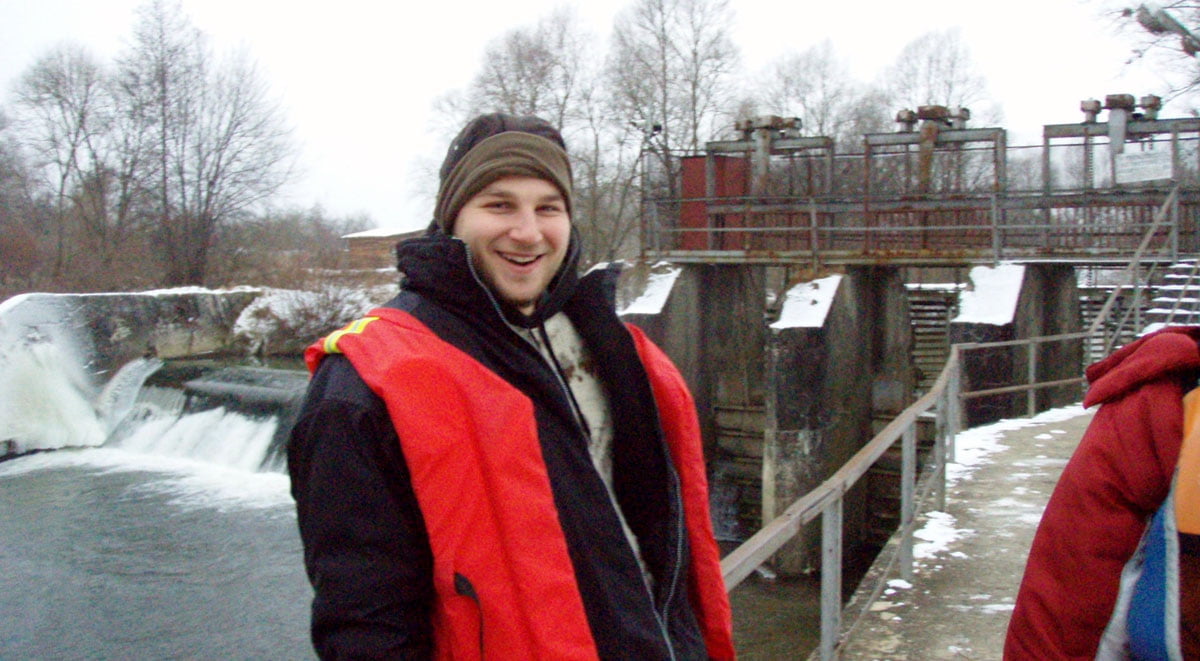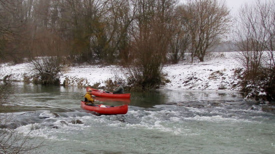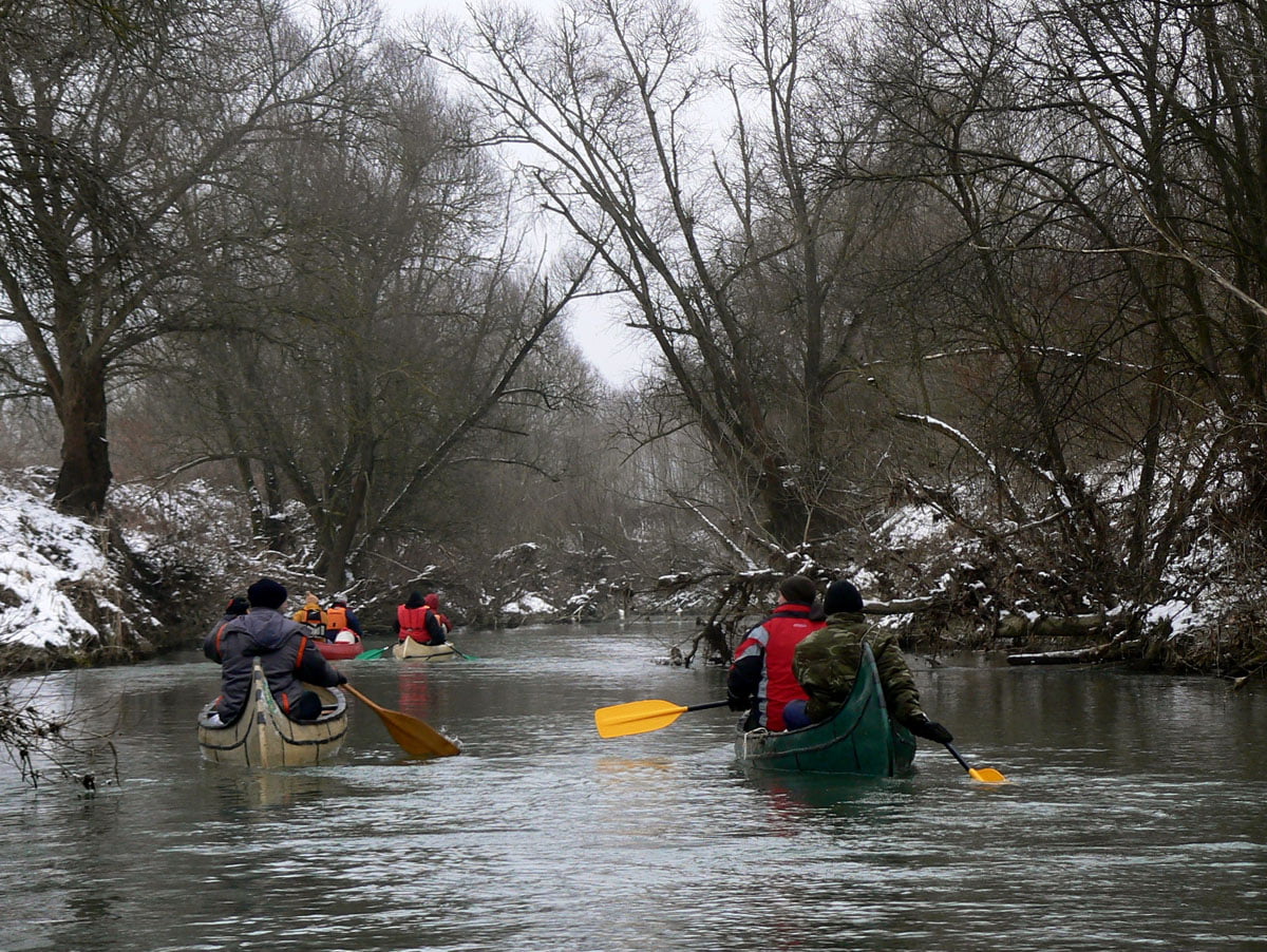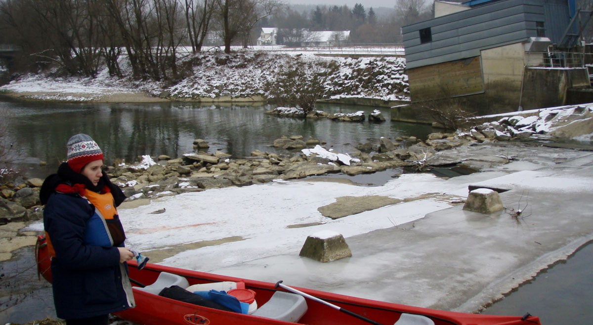 A magyar szakaszon egy erőmű állta utunkat. Ezen átemelve a hajókat remek szakaszára értünk a folyónak. Kilométereken keresztül gyors kanyarok követik egymást. A kormányzást nehezítik a bedőlt fák és a hordalékcsomók, így ez a szakasz igen technikás, gyors és pontos kormányzást igényel. Kenunkat egyszer rávezettem egy faágra, amitől a hajó erősen balra dőlt. Szerencsére kihagytuk a fürdőt a három fokos vízben, de mindenesetre Csabi szerint is izgalmas pillanatok voltak 😀